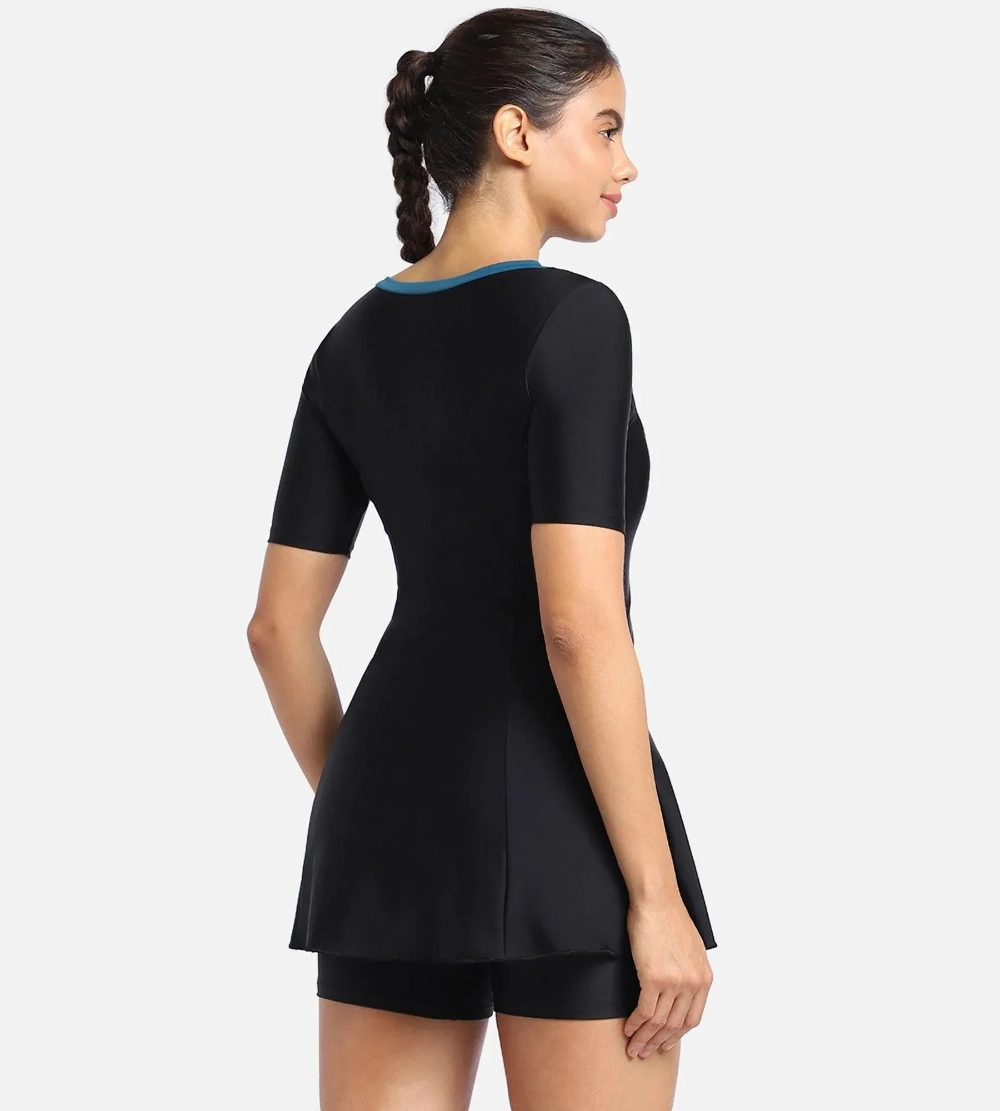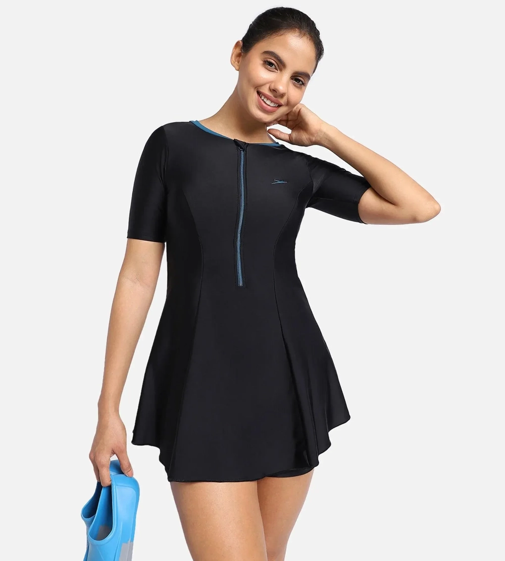 - Closed-back, short-sleeve design with front ziNylon/Elastane blend with chlorine-resistant Creora HighClopper for extra coverage and modesty.
